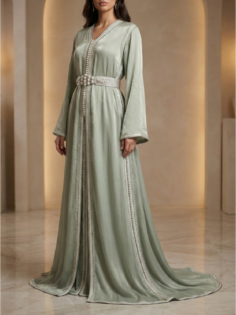 Pastelgroene kaftan uitgevoerd in zijde organza.